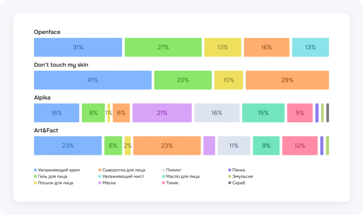 В нашем примере мы проанализировали не только функции, но и формы продуктов. Так, для увлажнения кожи лица у Openface помимо кремов есть гель и спрей-мист. Средства в виде гелей также фигурируют в сообщениях о Don’t Touch My Skin.
