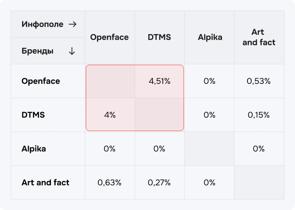 У Openface и Don’t Touch My Skin высокий риск оттока клиентов к конкуренту, поскольку так или иначе их сопоставляют в публичном поле. Помочь в такой ситуации маркам могла бы выстроенная стратегия позиционирования, в которой сделан упор на конкурентные преимущества бренда и отдельных продуктов.
