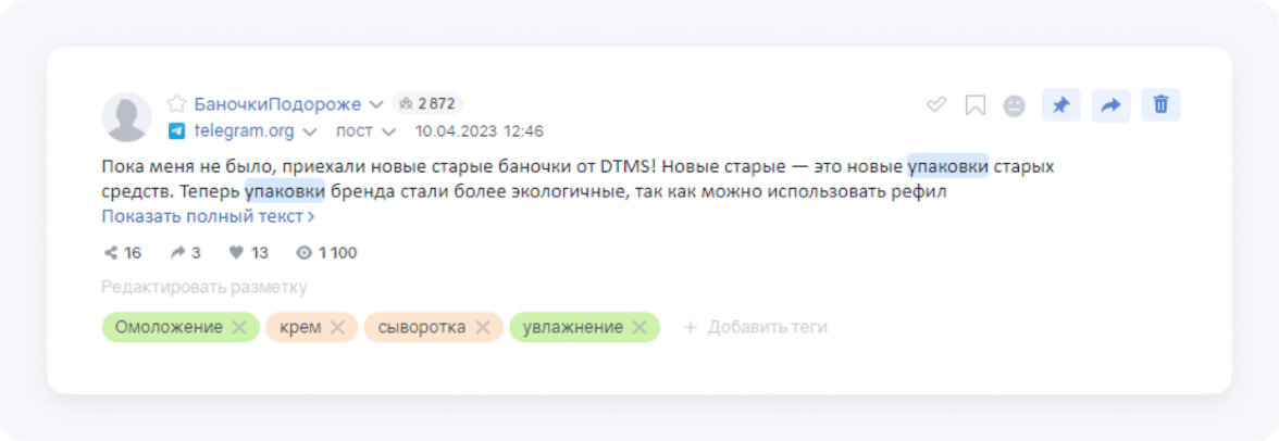 В анализе брендов косметики мы рассматривали обсуждения схожих продуктов у всех марок — кремов для лица. Пользователи соцмедиа чаще всего пишут о таких свойствах или аспектах этих товаров, как: