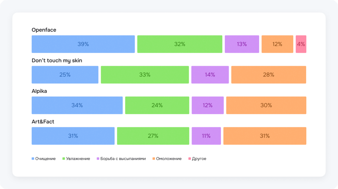 Какие функции товаров популярны у аудитории — используют клиенты ту или иную марку чаще для очищения или для увлажнения кожи, предпочитают пользователи скрабы или лосьоны определённого бренда и так далее. Такой анализ помогает найти сходства и различия в продуктовых линейках и понять, в каком направлении разворачивается конкуренция, а какие ниши свободны.