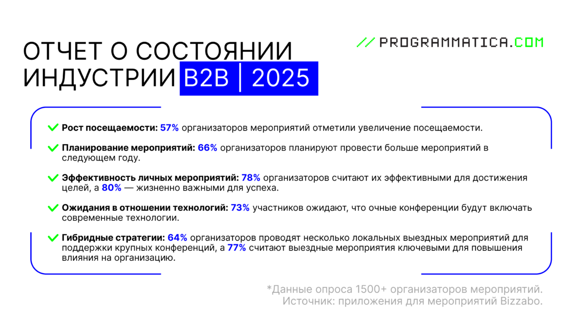 Programmatica.com считает, что выставки, форумы, конференции и закрытые отраслевые клубы полезны для компаний, нацеленных на рост. В этой статьей поделимся личным мнением, кейсами других компаний и статистикой, которая убедит вас в том же.