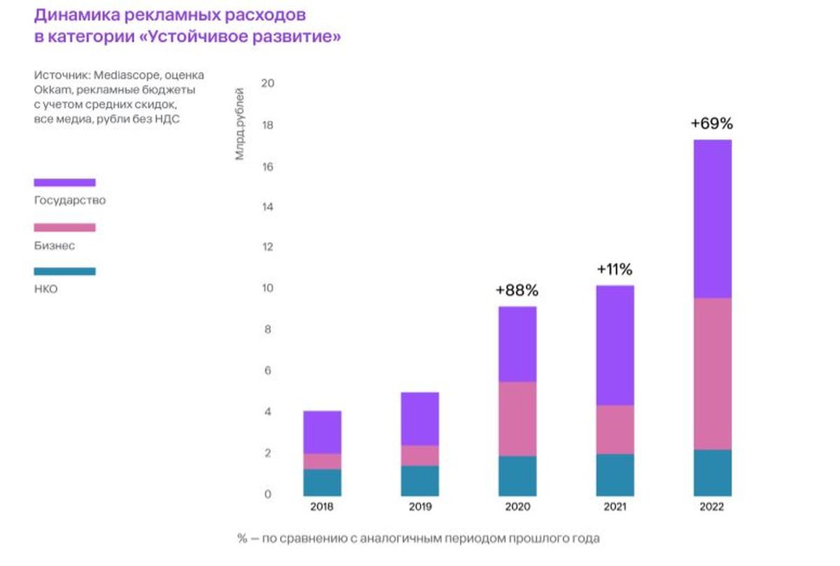 Впрочем, трансформация ESG-повестки пока никак не отразилась на медиаинвестициях. По расчетам агентства Better (входит в «Оккам»), в 2022 году на продвижение повестки устойчивого развития в России было потрачено более 17 млрд рублей (в 2018 году сумма составляла всего 4 млрд рублей). Доля категории в общих расходах на рекламу удвоилась с 3,4% в 2021 году до 7% в 2022-м. Это даже больше прогнозов на 2022 год, сделанных в 2021 году (было 5%). В первом квартале 2023 года также наблюдается активный рост инвестиций в ESG-маркетинг: +50% к первому кварталу 2022 года.