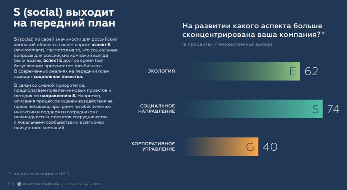 Социальный аспект обошел заботу об окружающей среде и ответственное корпоративное управление по своей значимости для 74% российских компаний. Экологическая повестка осталась в приоритете для 62% компаний, а улучшение систем управления — для 40%.