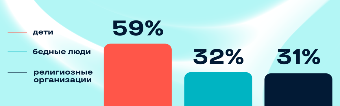 Также жертвователи выбирают не только куда сделать взнос, но и кому. Исследование благотворительного фонда «КАФ» показало, что в ТОП-3 наиболее актуальных категорий входят: дети, бедные люди и религиозные организации. Дети занимают первое место — их поддерживают более половины аудитории.