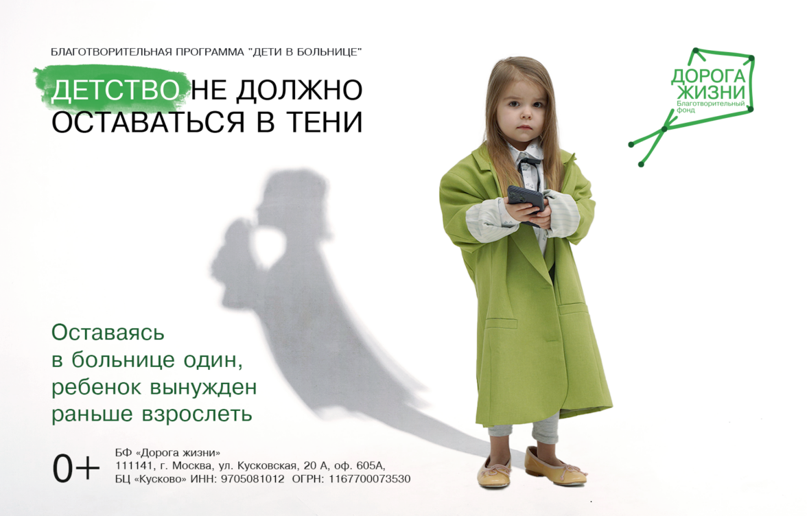 Благотворительный фонд «Дорога жизни» начинает масштабную социальную рекламную кампанию «Детство не должно оставаться в тени», направленную на помощь детям, оказавшимся в трудной жизненной ситуации без сопровождения взрослых. Ее цель — информировать о необходимости патронажного сопровождения детей, которые остались в больнице без попечения родителей, а также объяснить психологические аспекты и трудности, с которыми сталкивается одинокий ребенок в незнакомой обстановке. Проект реализуется в поддержку программы «Дети в больнице»*.