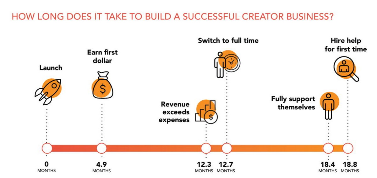 Обращаясь к небольшой аудитории, сложно рассчитывать на быструю финансовую отдачу. С момента начала своей карьеры до получения первого заработка от своего контента у автора-предпринимателя в среднем уходит 4,9 месяца. На то, чтобы уйти с прошлой работы и полностью отдаться любимому занятию, уходит 12,7 месяцев. Период, когда доходы автора смогут полностью его обеспечивать, в среднем составляет 18,4 месяца. А если бизнес автора пойдет в рост, то через 18,8 месяцев можно будет подумать о найме помощника.