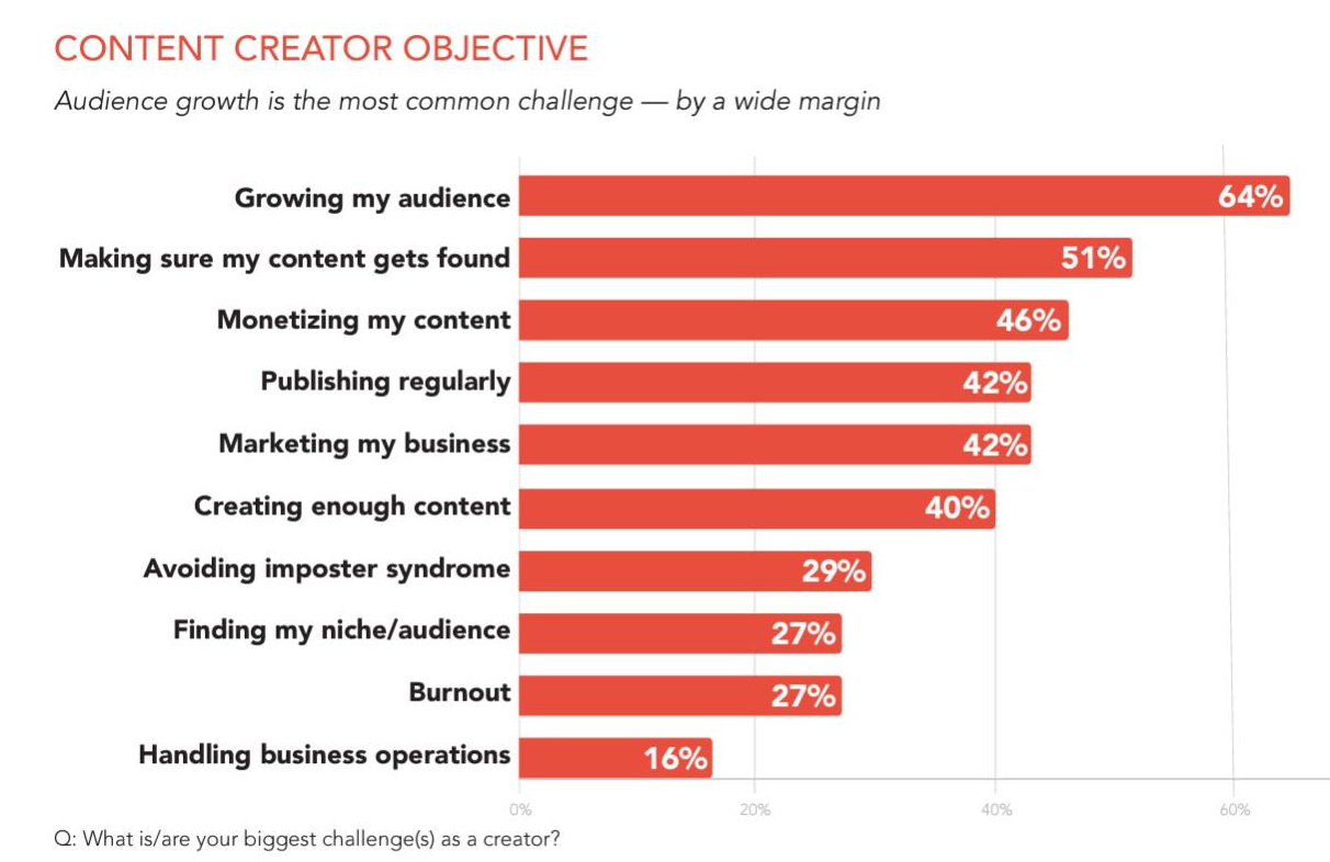 Своей основной целью на ближайшее время больше половины (64%) авторов-предпринимателей называют рост аудитории. 51% считает наиболее важным доступность своего контента зрителям. 46% видят основную задачу в монетизации, а 42% в регулярной публикации контента.