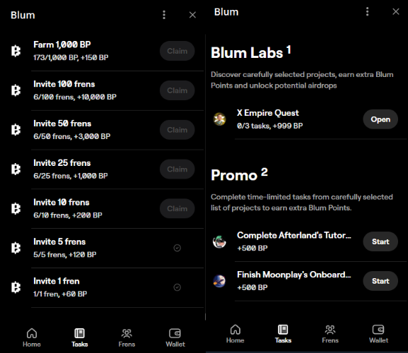 Кроме того, Blum предлагает возможность увеличения своих BP за счет приглашения друзей в игру и вступления в племя (Tribe). Чем больше рефералов присоединяется к Блум, тем больше BP можно заработать, что создает дополнительный стимул для приглашения рефералов игроками. Также дополнительные BP можно получить выполняя задания в игре, однако, список заданий ограничен.