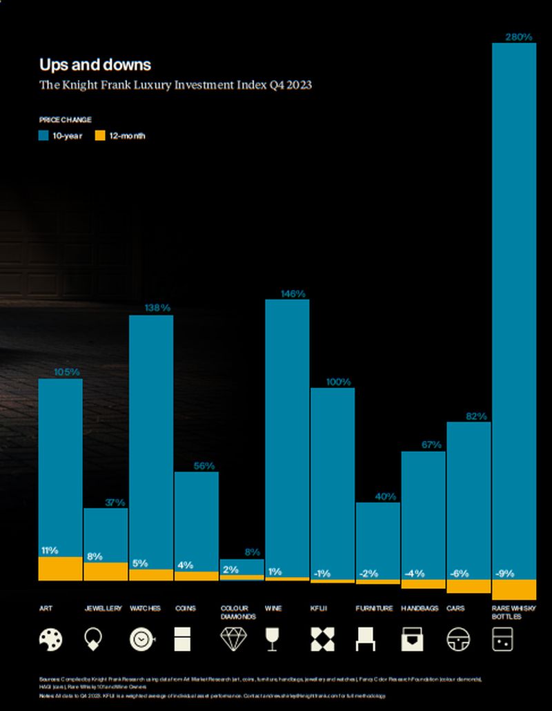 Инвестиции сверхбогатых в коллекционные вещи незначительно снизились на 1% в 2023 году. Провал по вложению денег показали редкие бутылки виски (-9%), автомобили (-6%), сумки (-4%), мебель (-4%) и вино (-1%). В положительной зоне оказались покупки предметов искусства (+11%), ювелирные изделия (+8%), часы (+5%), монеты (+4%) и цветные бриллианты (+2%).
