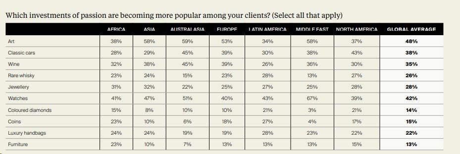 Исследователи прогнозируют, что в 2024 году представители UHNWI продолжат инвестировать в предметы искусства (48% респондентов), часы (42%), классические автомобили (38%) и дорогие вина (35%).