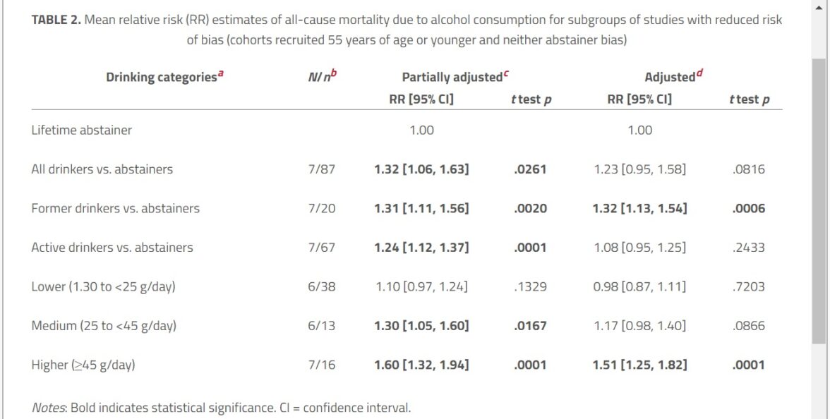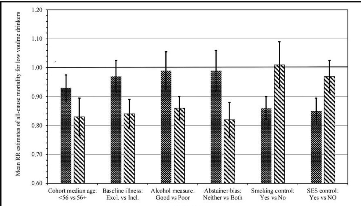 Как и предполагали ученые, исследования, участниками которых были более молодые люди, а также исследования, в которых бывшие и периодически пьющие участники отделялись от полных трезвенников, показали, что риск смертности для малопьющих практически такой же как для трезвенников. Относительный показатель риска — 0,98 (на повышенный риск указывает показатель выше 1). Что касается исследований «низкого» качества, то в них риск смертности для малопьющих был ниже, чем у трезвенников — 0,84.