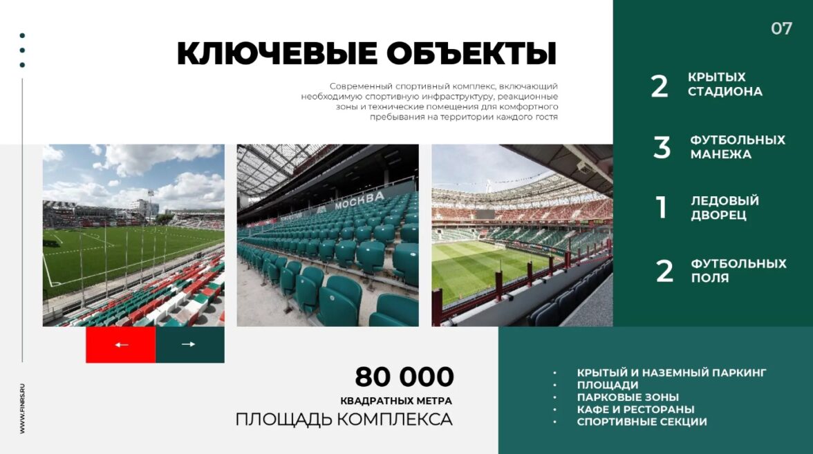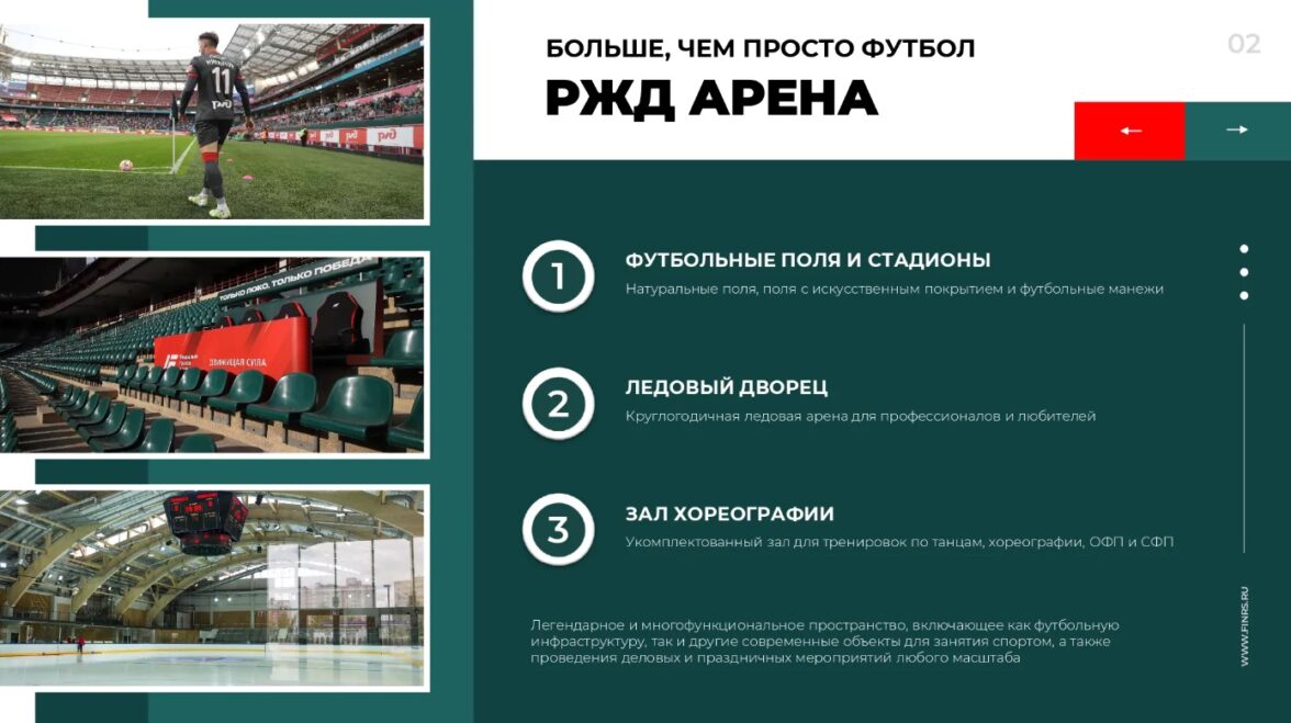 Поскольку бизнес заказчика — спортивный комплекс «РЖД-Арена», в презентации мы использовали фотографии с футбольных матчей и других спортивных мероприятий. В середине презентации мы поместили карту помещения, чтобы аудитории появилось представление об инфраструктуре комплекса.