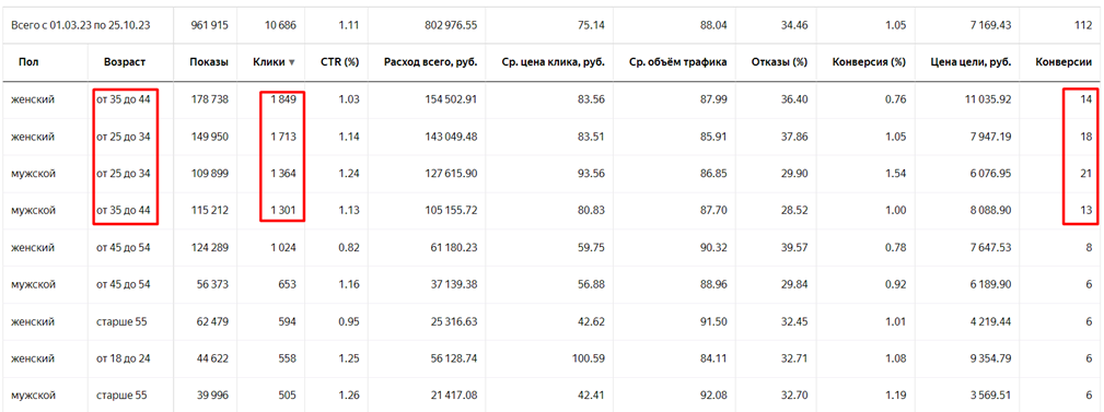 В ходе анализа мы выявили, что основу ЦА составляют мужчины и женщины от 25 до 44 лет. Поэтому также мы добавили в исключения тех, кто был младше 18 и старше 55 лет.