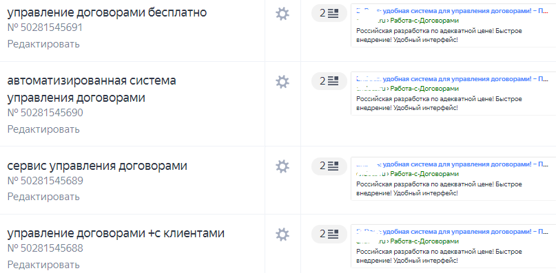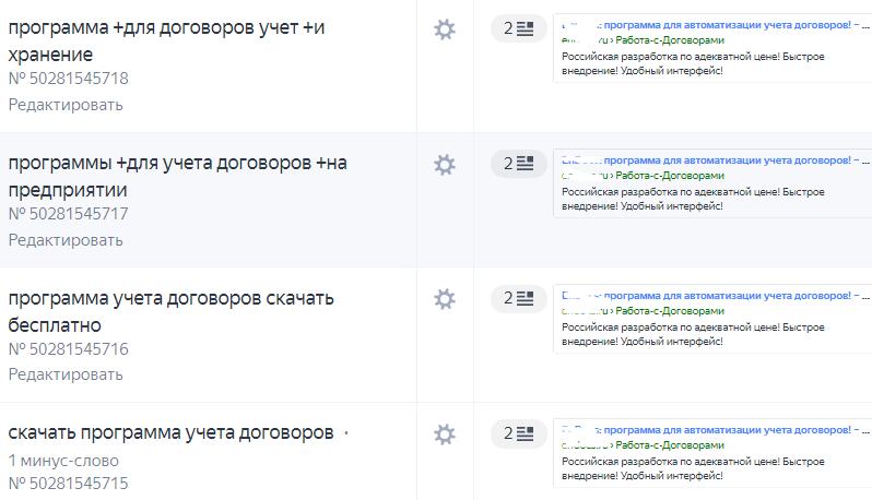 Изначально семантика была очень скудная. Например, по направлению Договоры была всего одна группа из 14 ключевых фраз, поэтому и рекламные объявления были очень «общими».