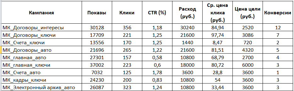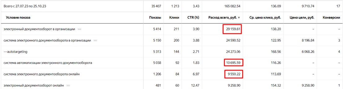 Затем мы проанализировали эффективность ключевых фраз в поисковой РК и отключили:
