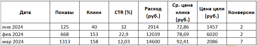 Спойлер: наилучших результатов можно достигнуть, если бюджет будет от 200 000 р. Например, в феврале расходы перевалили за 200 000 р, но при этом у нас было уже 33 лида по 6200 р. В марте при сходных тратах мы смогли привлечь уже 49 лидов по 4600 р.