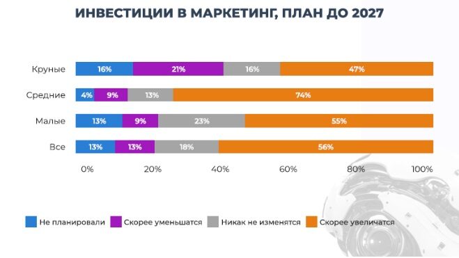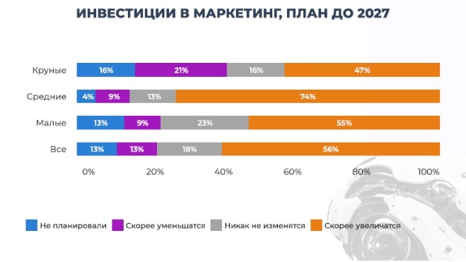 При этом в долгосрочной перспективе до 2027 года большинство (56%) компаний намерены наращивать инвестиции в маркетинг. Чаще всего о таких планах сообщали представители среднего бизнеса (74%). О вероятном снижении затрат на маркетинг чаще других заявляют в крупном бизнесе (21%).