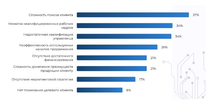Между тем, именно инструменты маркетинга способны подстегнуть рост бизнеса и его финансовых показателей независимо от размеров предприятия. Это следует из ключевых сложностей, замедляющих развитие компаний. Так, 37% респондентов отметили, что главная преграда — это сложность поиска клиентов. Этот фактор опередил даже общую боль российской экономики — кадровый голод, его назвали только 34%. Кроме того, 26% посетовали на неэффективность используемых каналов продвижения, 21% — на сложность донесения преимуществ продукции клиенту, 17% — на отсутствие маркетинговой стратегии. Наконец, 8% опрошенных в числе главных преград для развития бизнеса обозначили непонимание целевого клиента.