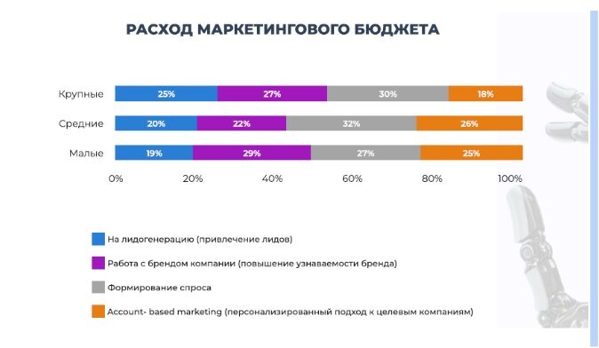 Наиболее значимыми инвестициями в маркетинг отличается малый бизнес (с выручкой до 800 млн руб. в год) — 15% от оборота компании. В среднем бизнесе (от 800 млн до 2 млрд руб. в год) — 12%, в крупном (более 2 млрд руб. в год) — 6%. Категории трат маркетингового бюджета также отличаются в зависимости от размеров бизнеса. Так, самая большая статья расходов на маркетинг в малых компаниях — это повышение узнаваемости бренда (29%), а в средних и крупных — формирование спроса (32% и 30% соответственно). Меньше всего крупный бизнес тратит на персонализированный подход к целевым компаниям (18% маркетингового бюджета), а средний и малый — на лидогенерацию (20% и 19% соответственно).