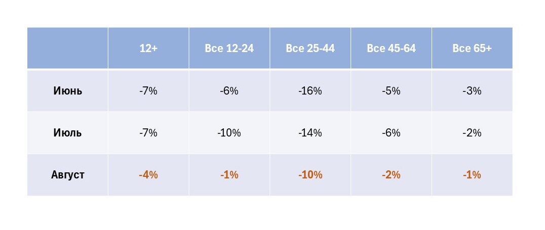 При этом скорость снижения интереса к ТВ, которое можно было наблюдать у молодежи, ощутимо упала после того, как YouTube стали замедлять: с 10% до 1% среди молодежи 12–24 лет, и с 14% до 10% — 25–44 лет. Вместе с этим, аудитория YouTube сократилась на 15% уже в первый месяц замедления