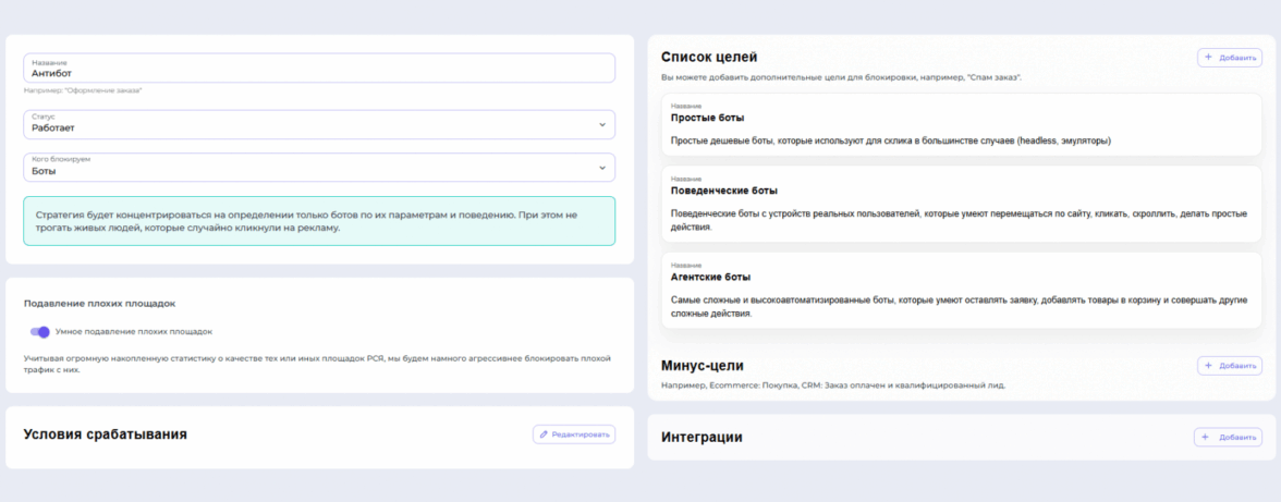 Кастомная модель Sales Ninja умеет не только выявлять ботов — она умеет не задевать тех, кто действительно важен. В редакторе антибота можно добавить минус-цели, например «Покупка» в ecom или «Заказ оплачен» из CRM. Пользователь, который совершил целевое действие, никогда не получит высокую фрод-оценку, независимо от того, как выглядело его поведение на сайте. Это страховка от ложных срабатываний в самый важный момент — когда человек готов купить, система точно не заблокирует его как бота.