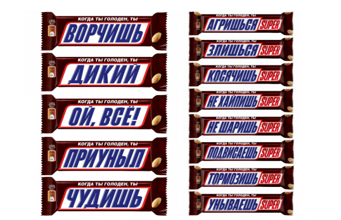 Бренд шоколадных батончиков разработал умные кампании, чтобы у людей сложилось впечатление, что употребление «Сникерса» превратит их из голодных и рассеянных в бодрых и довольных. Например, известный призыв «не тормози — сникерсни», или относительно недавнее обновление надписей на батончиках — глаголы, которые описывают возникающие из-за голода ощущения:
