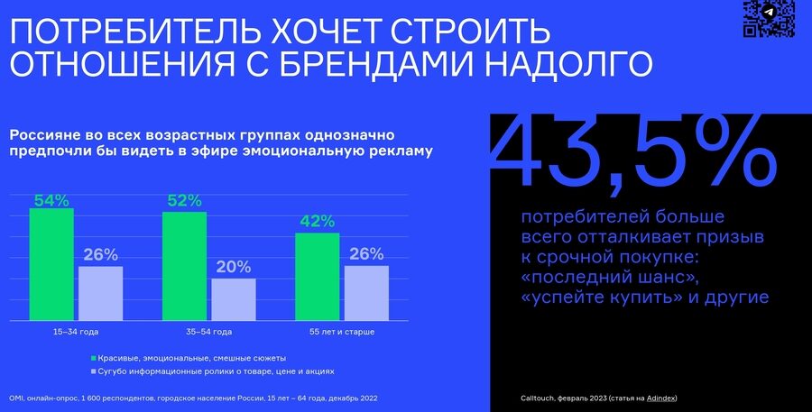Согласно внутреннему исследованию Национального Рекламного Альянса люди сегодня устали от сообщений в духе «успейте купить» и хотят больше эмоциональной составляющей в рекламе. То есть потребители готовы к тому, что через медиа им дадут знания о компании, расскажут глубинные смыслы и ценности, а не просто будут «разводить на покупку».