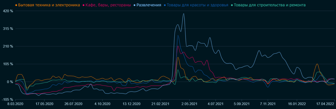 Объём расходов потребителей на товары и услуги относительно сопоставимой недели предшествующего года (%г/г), в т.ч. в разделе категорий.
