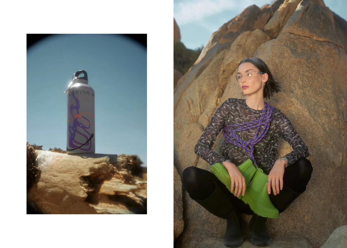 Теперь подошла очередь Facultative works — мультидисциплинарной дизайн-студии. Коллекция — синтез органики и технологии, реальности и виртуальности, будущего и настоящего. Тут и AR-футболка, которая интегрируется в дополненную реальность, линейка непромокаемой одежды, брелок с карабином, бутылка — всё, что нужно для летнего феста на природе (и не только).