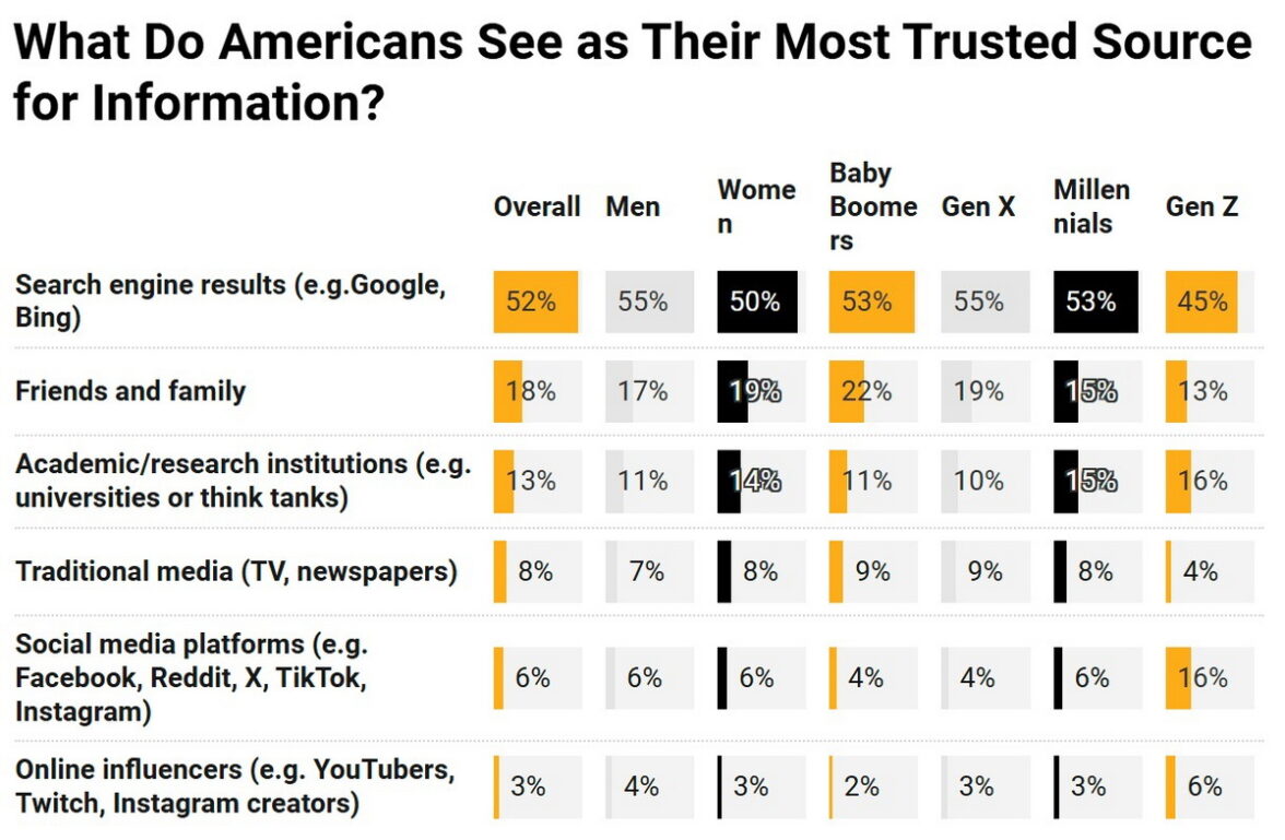 Американцы доверяют информации из интернета. Но доверие к разным интернет-источникам неодинаково. Результатам поиска верят 52% респондентов (максимум), соцсетям — 6%, а инфлюенсерам — 3% (минимум). Если же говорить о доверии к информации в целом, то между поисковиками и инфлюенсерами затесались друзья и близкие (18% — второе место), академические и исследовательские учреждения (13% — третье место), печатные СМИ и телевидение (8% — четвертое место) и соцсети (6% — пятое место).