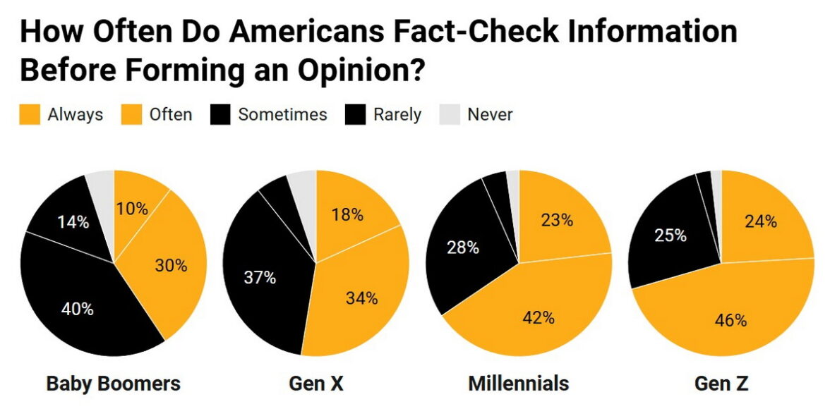 Практика проверки информации по альтернативным источникам становится привычным делом: 55% участников исследования рассказали, что ищут подтверждения информации на стороне. Чаще всего фактчеком занимаются зумеры — 70% респондентов этой возрастной категории заявили, что не спешат сразу доверять информации и предпочитают проверять факты. От зумеров немного отстают миллениалы, среди которых 65% занимаются фактчеком. За ними следуют люди поколения X (52%) и недоверчивые бэби-бумеры (40%).