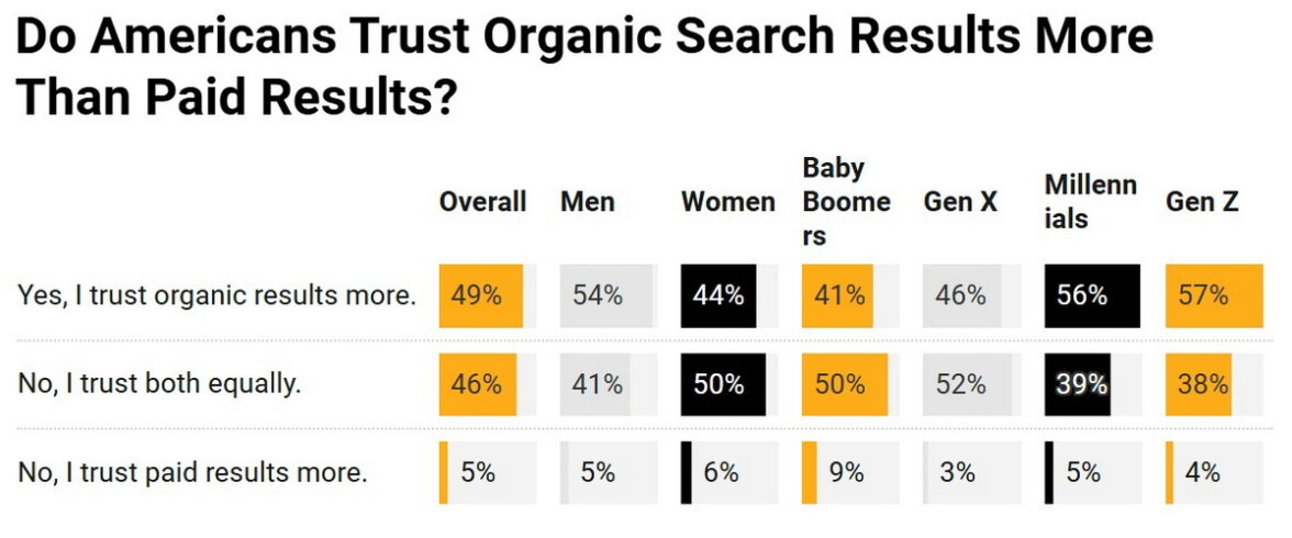 Половина американцев (49%) больше доверяет органическим результатам поиска, полагаясь на алгоритм ранжирования. 46% доверяют одинаково и алгоритмам, и рекламе. И лишь 5% респондентов верит рекламе больше, чем алгоритмам. Предпочтение органике отдают 54% мужчин и 44% женщин.