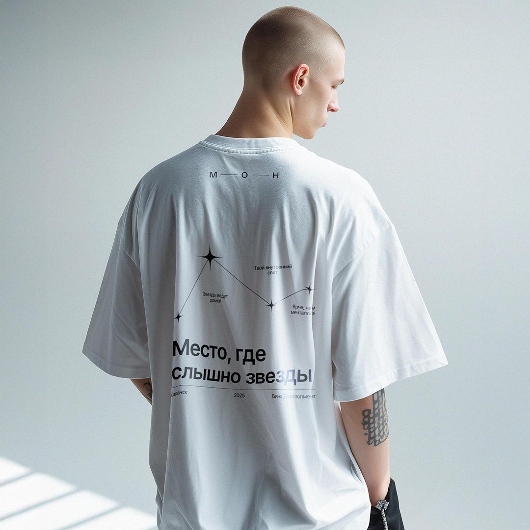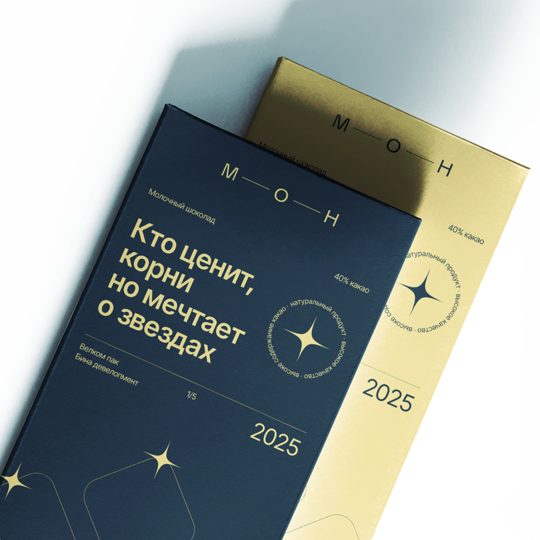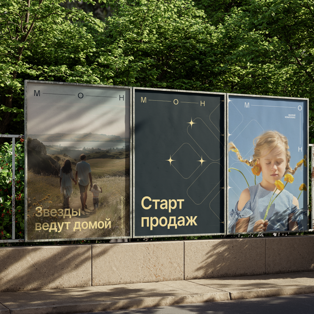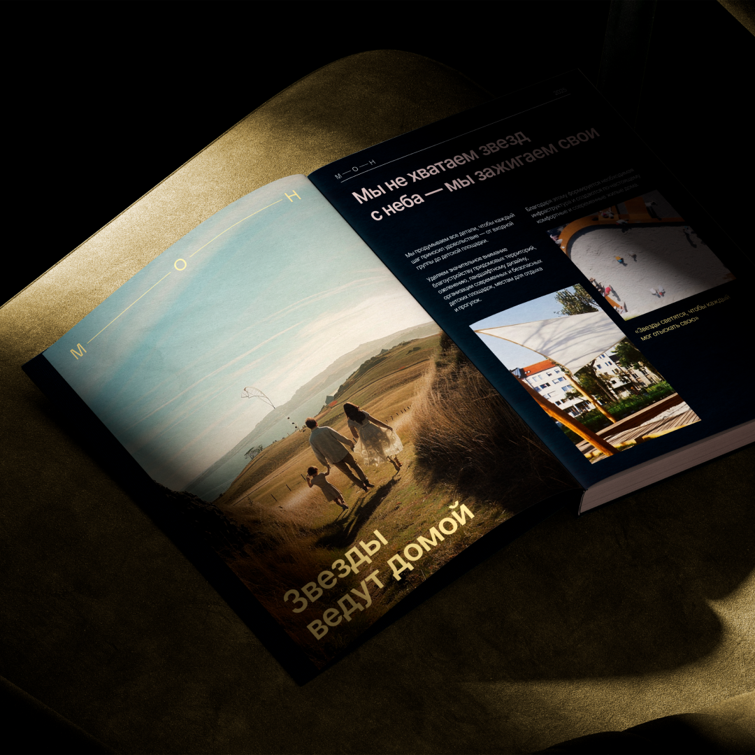 «МОН» — дом для тех, кто ценит надежность и уют, но не готов отказываться от свободы и вдохновения. Мы предложили не «хватать звезды с неба», а зажигать свои — дома. Метафору поддержали и фирменным стилем: логототип стал единым созвездием — его буквы соединены «нитями» и легко перестраиваются. А теплая и «родная» палитра поддержала настроение.