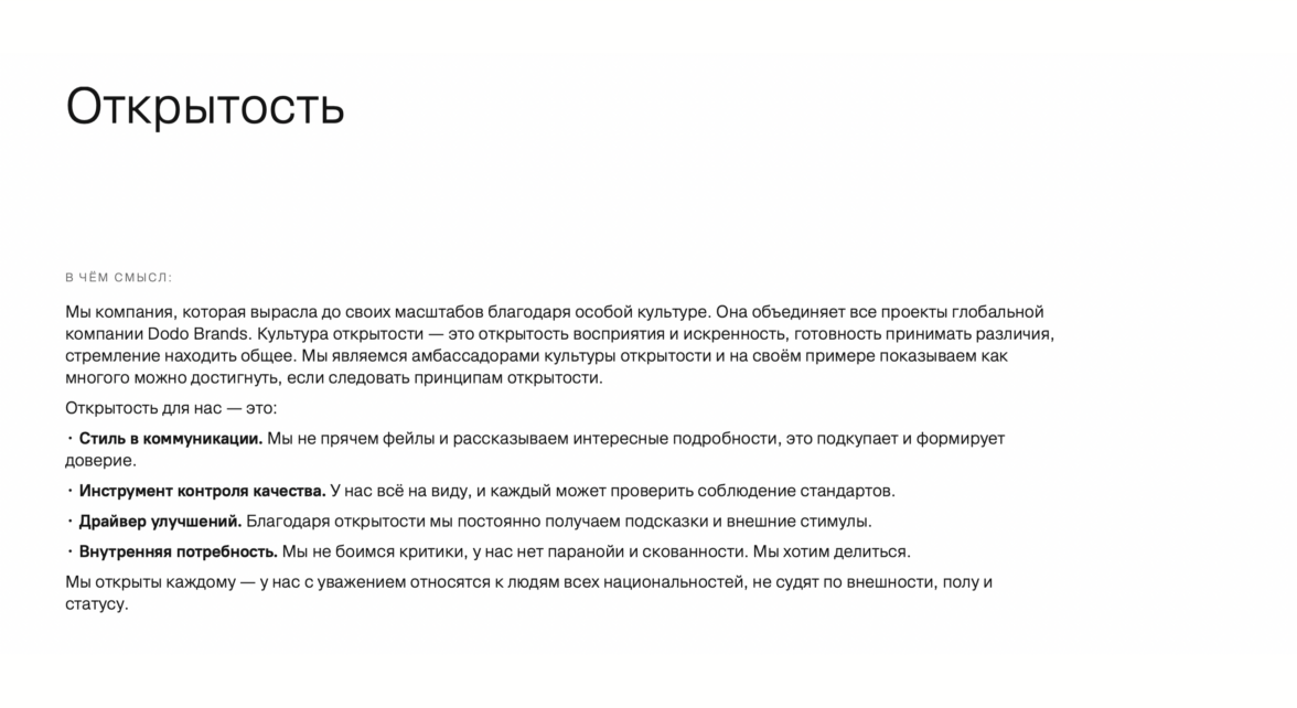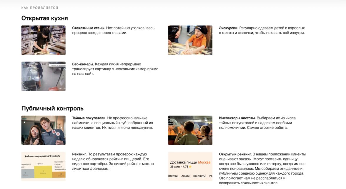 Ценности подробно описаны, а ещё подтверждаются действиями. Если продолжать тему открытости, Додо Пицца говорит, что строит пиццерии со стеклянными стенами, за которыми видно кухню, даёт доступ к камерам, проводит экскурсии и другие мероприятия.