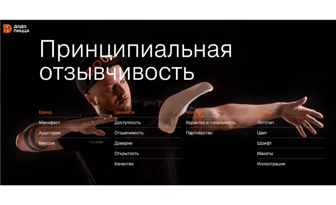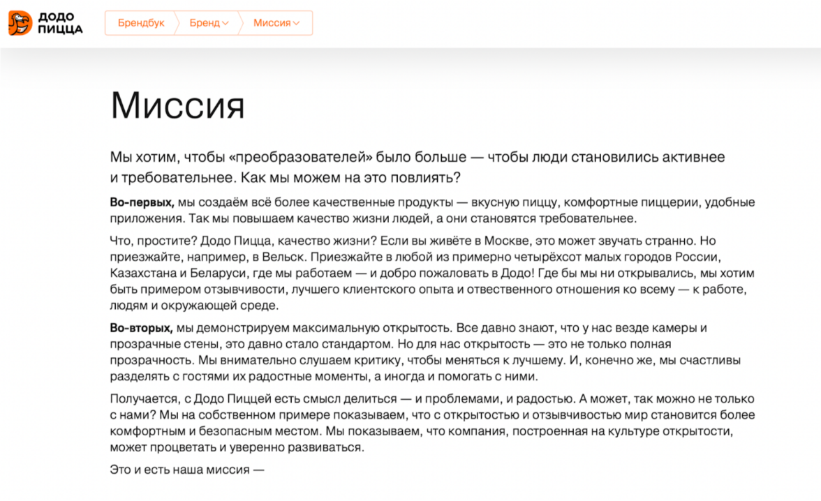 Книга бренда сети пиццерий наглядно демонстрирует одну из ценностей компании — открытость. Это целый раздел сайта, который детально описывает бренд Додо Пицца со всех сторон.