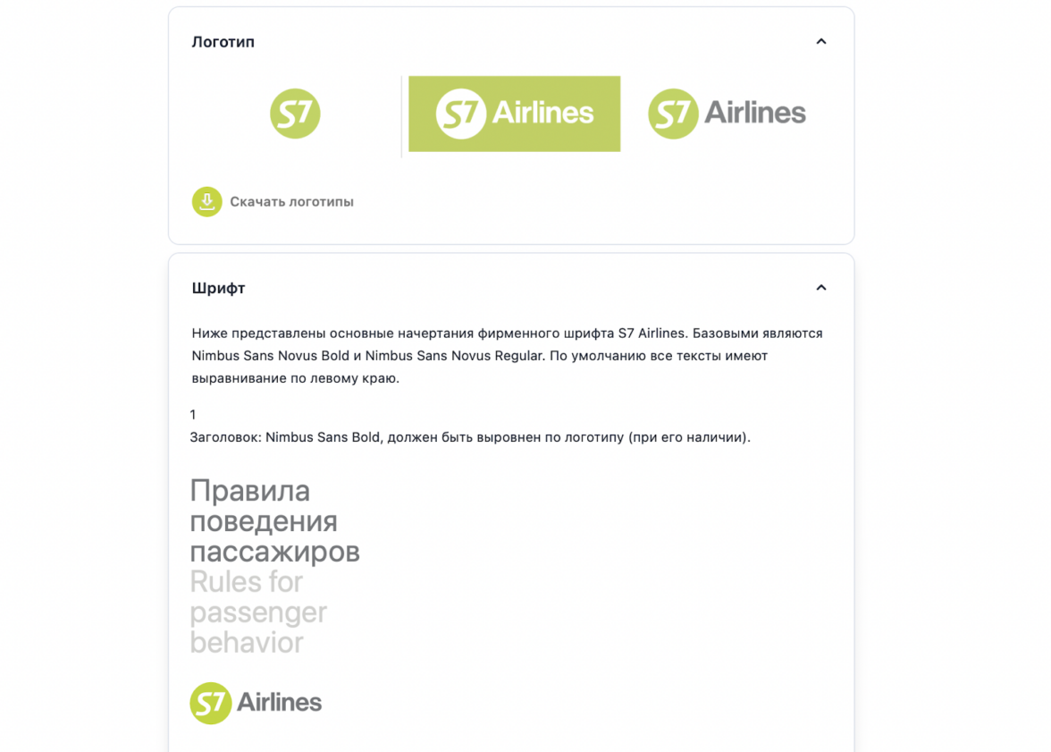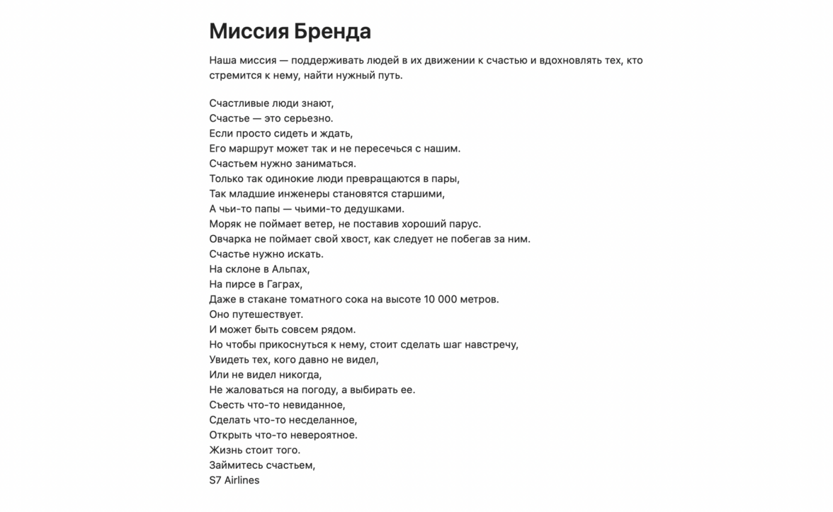 Краткий брендбук авиакомпания S7 в открытом доступе на сайте. Здесь оригинально подаётся миссия бренда, которую иллюстрируют почти поэтическим текстом.