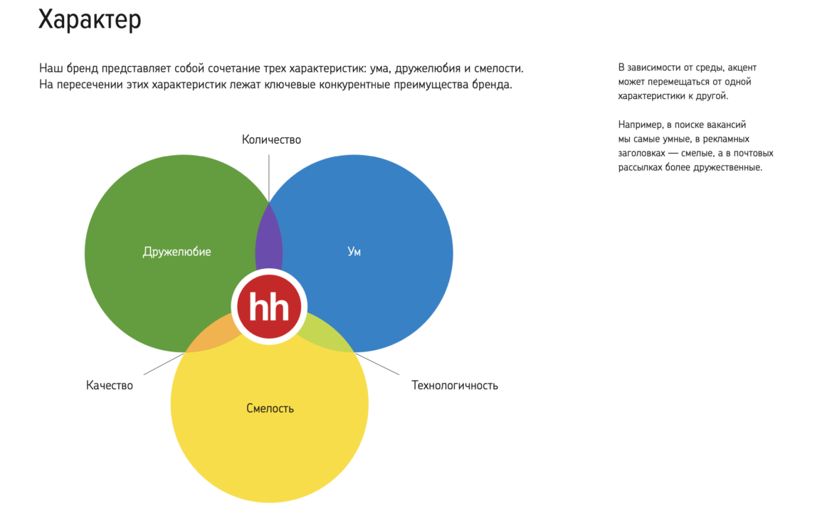 Брендбук сервиса по поиску работы и сотрудников классический. Здесь обозначается философия бренда с миссией и характером, который изобразили наглядно через кружочки — это нестандартное решение.