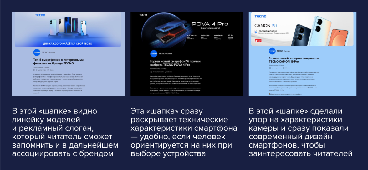 • Познакомить пользователя с продуктом и брендом. Смартфон — это сложное устройство. Короткие форматы, как контекстная реклама или посты в соцсетях, подходят для продвижения только в том случае, если пользователь уже знаком с брендом. Для TECNO они не подходят — пользователей нужно не просто привлечь, но еще и объяснить, какие преимущества товара именно у этого бренда, убедить, что качеству и бренду можно доверять. А это возможно сделать только с помощью длинного рекламного формата — статей. ПромоСтраницы — идеальный вариант: можно выпускать подробные обзоры смартфонов, чтобы глубоко погрузить читателя в продукт и помочь сформировать представление о бренде.