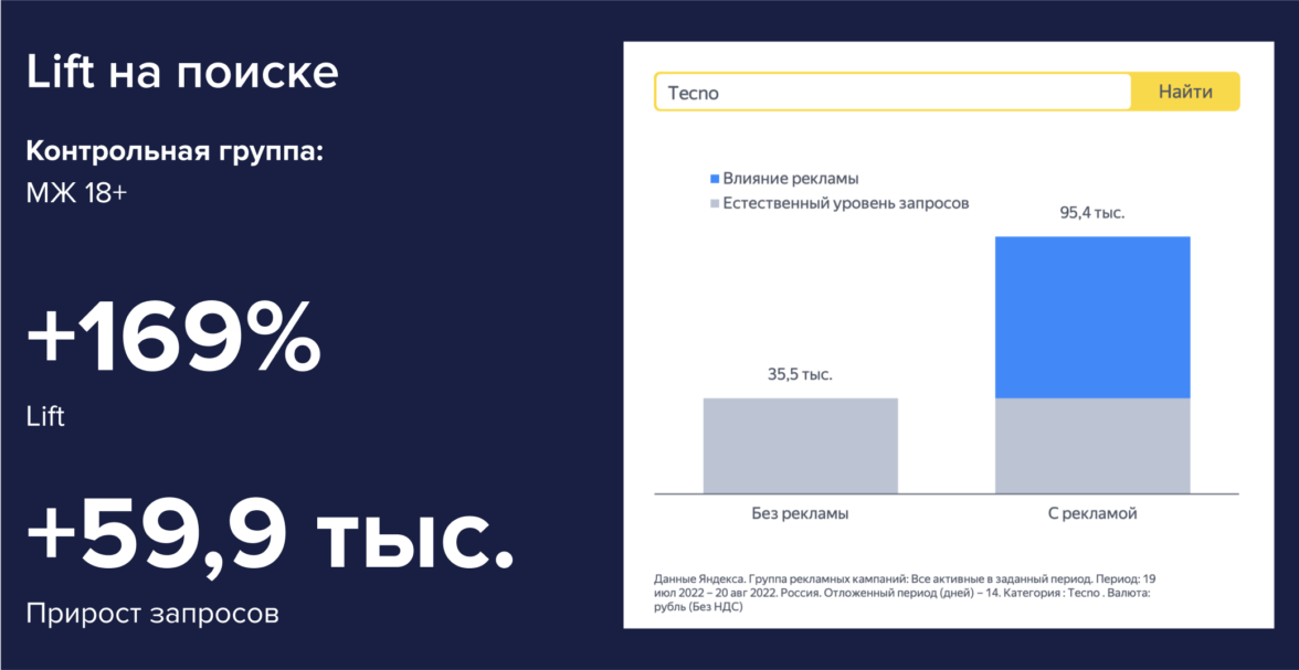 Такие брендформанс-инструменты как ПромоСтраницы помогают новым брендам или брендам, которые хотят привлечь больше новой аудитории, генерировать Search Lift и при этом приносить продажи — работать на всю воронку продаж одним рекламным инструментом.