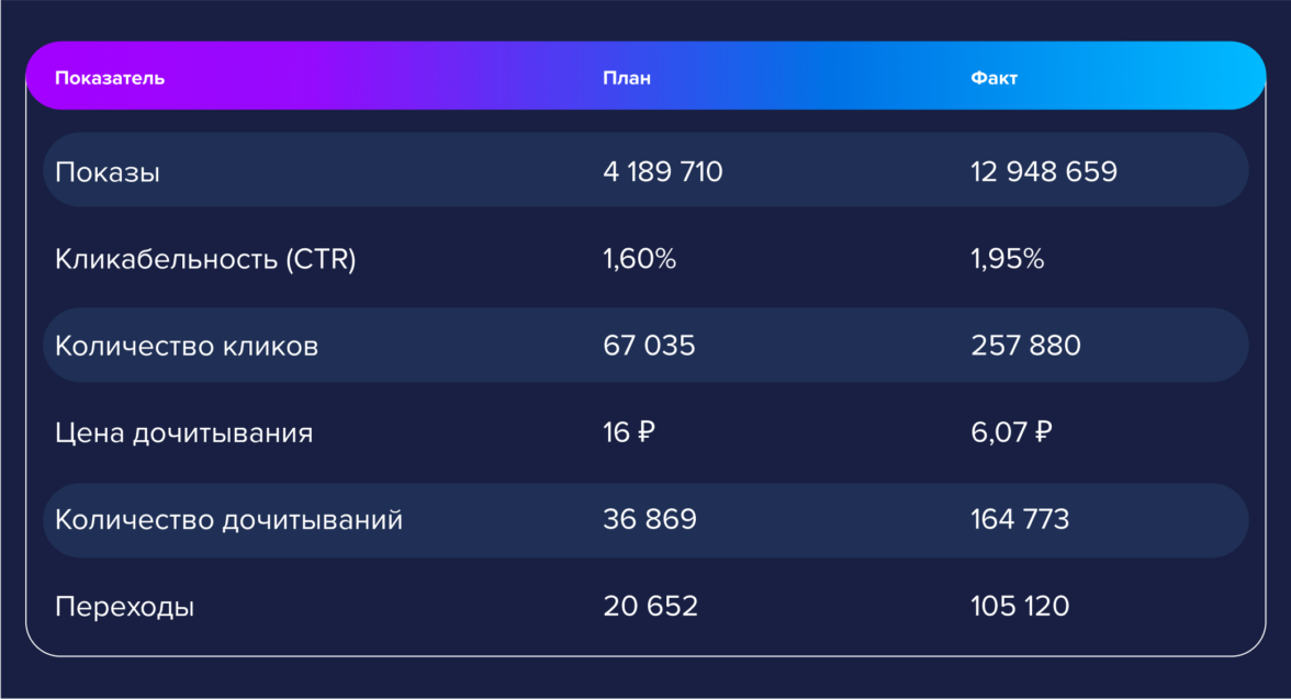 Цена дочитывания оказалась в 2,6 раза ниже запланированной. Кроме того, удалось превысить показатели по кликабельности, дочитываниям и переходам