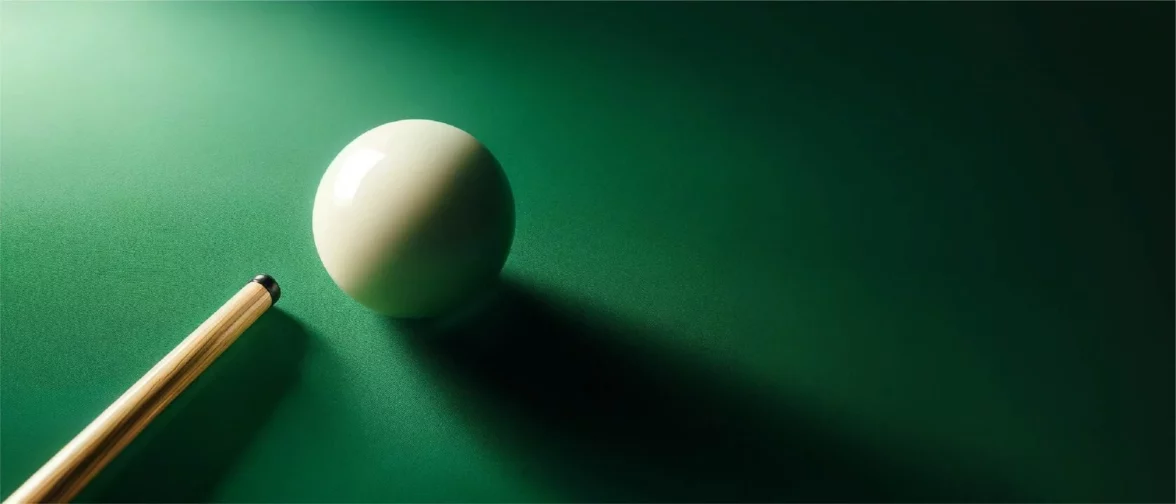 Шар, освещенный мягким светом, отбрасывает динамичную тень, создавая ощущение движения и напряжения момента перед решающим ударом. Рядом с шаром — часть бильярдного кия, символизирующая мастерство игрока.