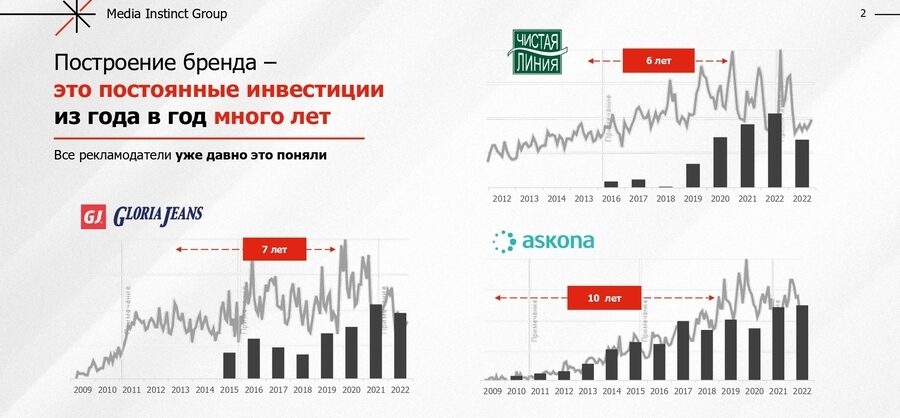 Для сравнения возьмем 2022 год, когда снижение потребления наблюдалось по всему рынку FMCG (товары повседневного спроса). Те бренды, которые в это время совсем отказались от имиджевой рекламы, потеряли по 2—3 пункта рынка, и на их место пришли те, кто в это время активно инвестировал в брендинг.