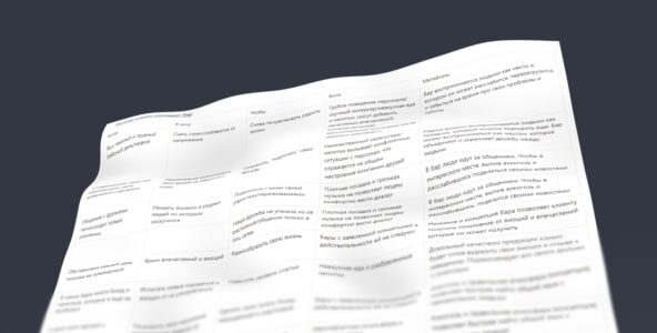 По классике стартанули с исследований. Пообщались с собственниками. Сходили в несколько схожих баров. Отправили ведущего дизайнера Сережу в Москву, чтобы он побывал на территории бара и изучил локацию. Сделали выводы, написали джобсы и нашли удачную идею.