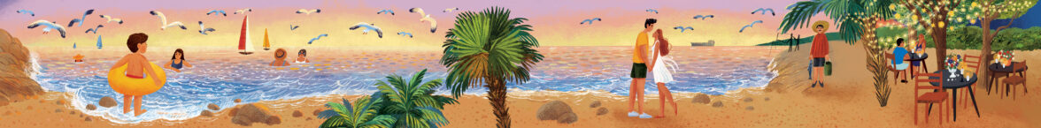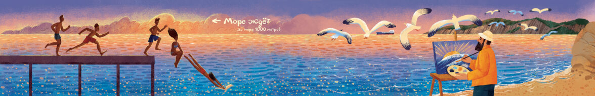 В ходе разработки концепции мы перебрали несколько подходов и в итоге остановились на идее показать курортную романтику и приятное времяпрепровождение. Стиль иллюстраций хотелось подчинить этой идее. Он легкий, свободный, даже немного наивный и радостный. Ирина Лисичкина сама придумывает сюжеты и детали, подходит к ним по-доброму и с юмором, поэтому именно она стала идеальным художником для нашего проекта.