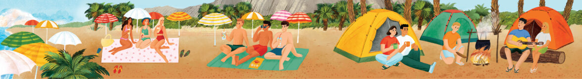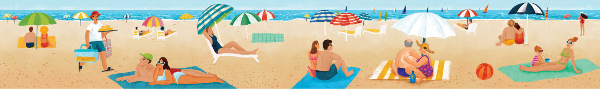 Сюжеты для иллюстраций появлялись постепенно. Сначала мы наметили общие темы, потом в процессе эскизирования появились разные детали. Я работала и с референсами, и с собственными наблюдениями и воспоминаниями о пляжном отдыхе. Некоторые забавные моменты появлялись в самом конце, например неравномерный загар одного персонажа — под футболку, шорты и носки.