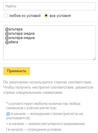 Для брендов на латинице не забудьте указать русские варианты. Например, к @альтера надо еще добавить @альтера медиа, @альтера-медиа и @altera — то, как люди пишут названия. Такая настройка позволит объединить в одну группу всех нужных нам посетителей.