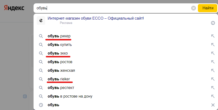 Конечно, подсказки формируются поисковой системой с учетом многих факторов (например, региона, спроса, поведения пользователей), но самой возможности это не отменяет. Если у вас есть лидерство по брендовым фразам, попасть в подсказки уже станет проще.