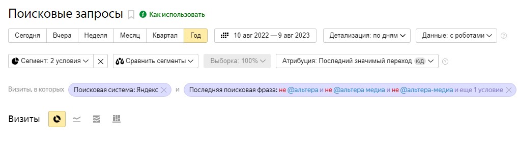 Выделять трафик мы уже умеем. С той лишь разницей, что небрендовым трафиком мы будем считать тот, что не включает любое из упоминаний брендов. Поэтому просто строим логическое отрицание (символ !) и объединяем их по параметру с соблюдением всех условий (по правилу логического отрицания предыдущей операции «или»). У нас должно получиться: !@альтера, !@альтера медиа, !@альтера-медиа, !@altera. Результат должен быть примерно таким: