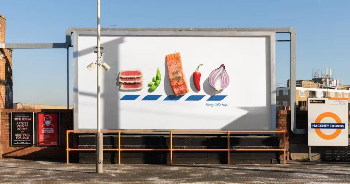 Наружная реклама крупнейшего британского ритейлера Tesco появилась в Лондоне на прошлой неделе. Имя бренда было зашифровано в названиях еды, которая продается в его супермаркетах. Креативное агентство BBH London посчитало, что логотип и фирменный стиль с синими полосками Tesco достаточно узнаваем и решило проверить, действительно ли это так.