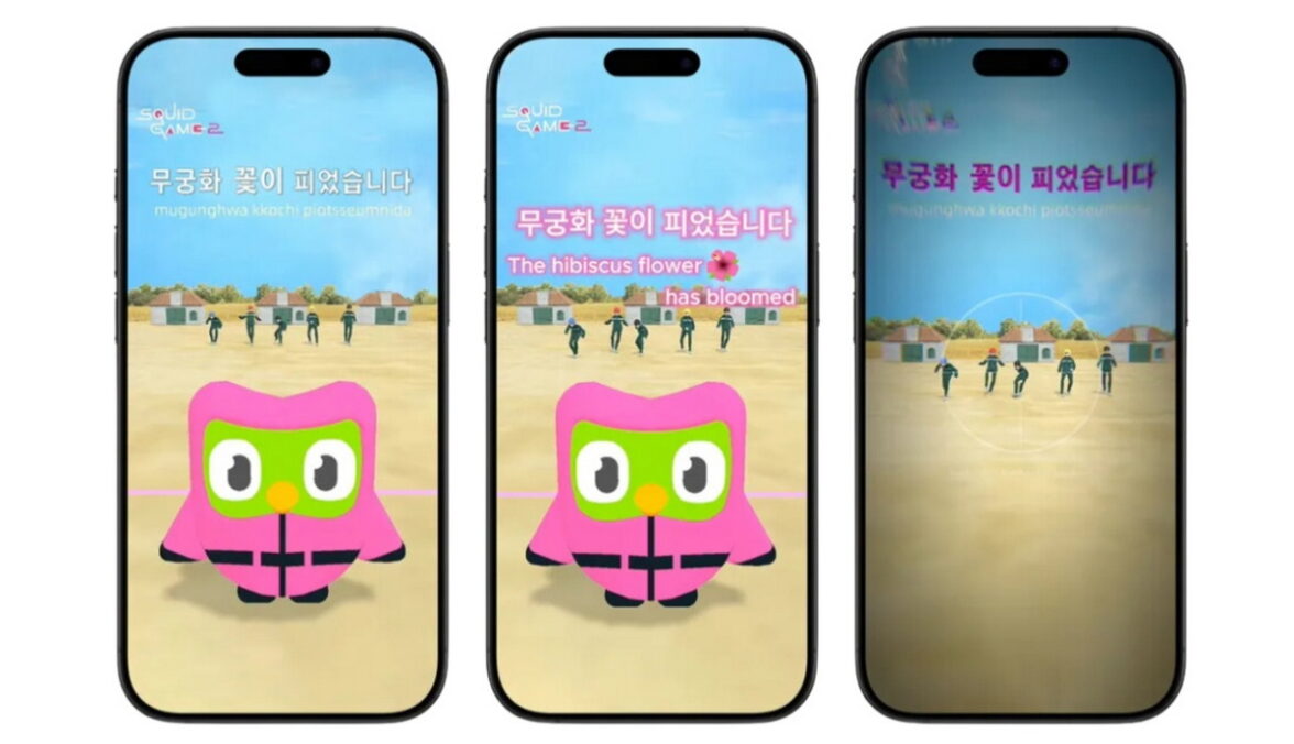 Еще один пример коллаборации в корейском стиле — сотрудничество Netflix с приложением для изучения иностранных языков Duolingo. Пользователям, изучающим корейский, предлагается челлендж по мотивам «Игры в кальмара».